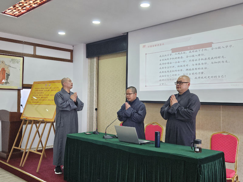 紧接着,本一班班长圣进法师代表本一全体学僧向全校学僧发出“放下手机,静心修学”的倡议。随后本二班长心缘法师代表其它年级学僧做了表态发言并做出积极响应。