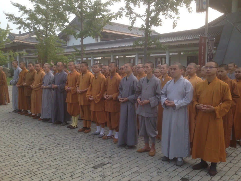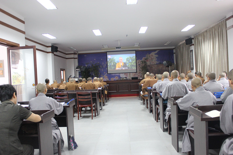 9月9日,鉴真佛教学院新学期第一次升旗仪式。能修大和尚开示。能修大和尚开示学僧结弥陀印聆听开示