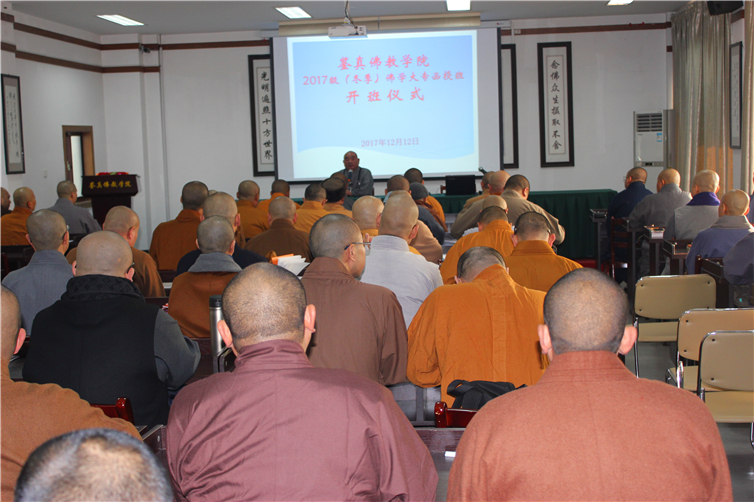 2017年12月12日9时,我院2017级(冬季)佛学大专函授班开班,来自全国各地寺院的100多名法师出席开班仪式。江苏省佛教协会副会长、鉴真学院院长能修大和尚出席开班仪式并开示。他希望全体学员认真贯彻十九大精神,不忘初心,正信正行,积极服务社会,利益众生。并勉励大家多闻、多思、多修,认真学习,教学相长,圆满完成三年学业。...