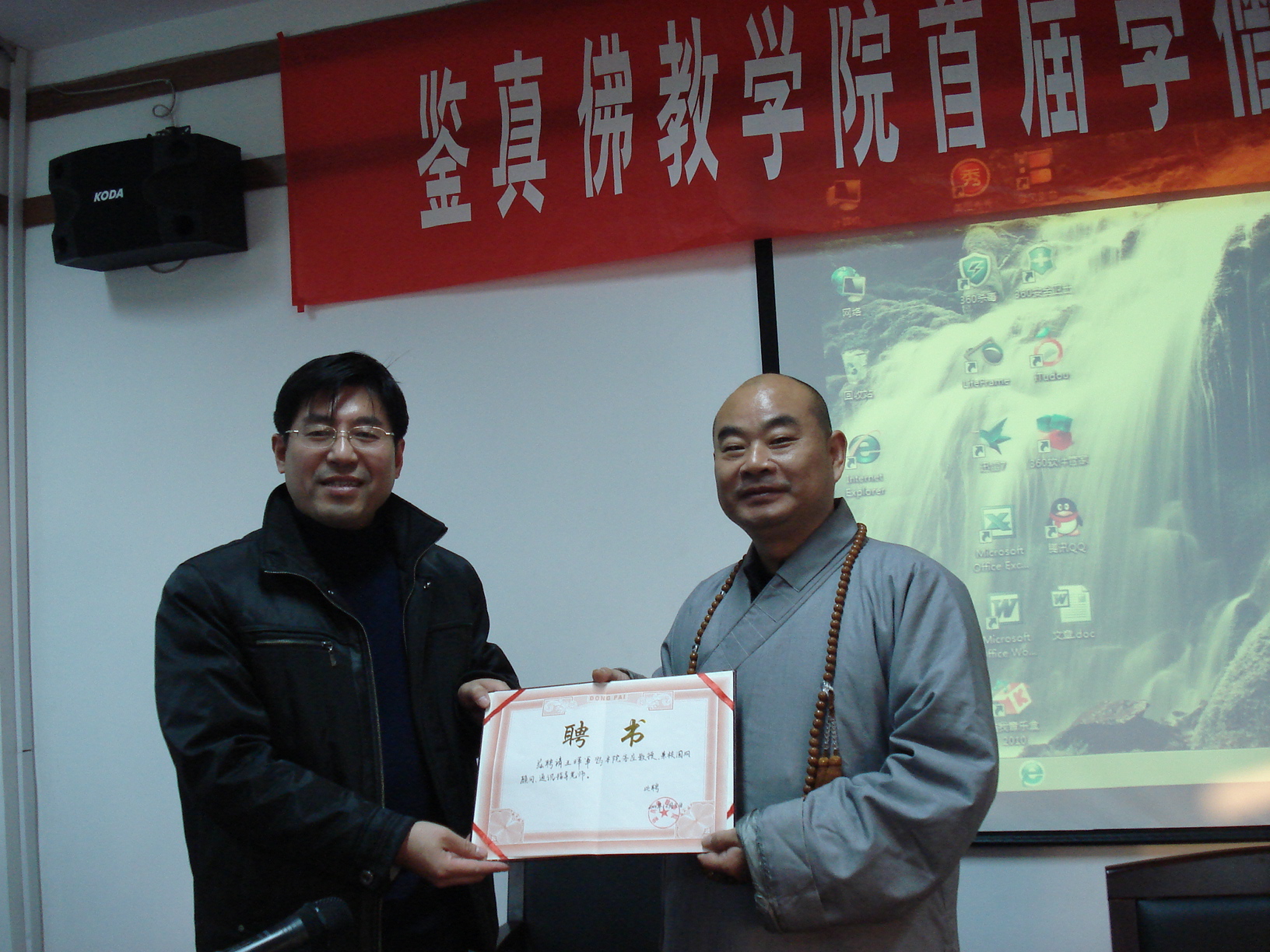 12月10日下午,扬州日报社主任记者王晖军应邀来学院作专题讲座,对学僧进行通讯报道、《鉴真东渡古筝曲》创作策划等进行现场辅导。能修方丈为王晖军主任颁发了义务支教聘书。现场讲座学僧认真听讲能修发方丈颁发聘书...