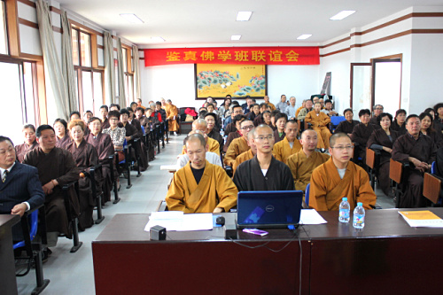 2012年10月22日下午2点,鉴真学院法喜充满,100余名佛学班居士齐聚我院,参加了鉴真佛学班联谊会。联谊会由明空法师主持,能修方丈就如何学佛成佛进行了开示,希望广大信众存好心、说好话,做好事,怀着菩提心去念佛学佛,征菩萨道。仁永法师介绍了下一步鉴真佛学班的办班内容。学院法师老师和居士们先后表演了男女生合唱《皈依歌》、法师合唱《观音菩萨如秋月》、二胡独奏《...