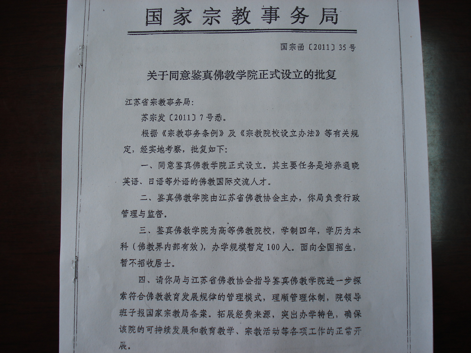 2011年3月17日,国家宗教局批复鉴真佛教学院正式设立,成为全国唯一一所培养外语人才的高等佛教本科院校。鉴真学院由江苏省佛教协会主办,目前设有英语、日语两个专业,学制四年。学院以“突出外语教学,注重律宗研修、弘扬鉴真精神”为办学特色;坚持“以质量求生存,以特色求发展”的办学思路,实行“学修一体化、生活丛林化”办学方式。在教学中注重夯实文化基础、提升佛学素养...